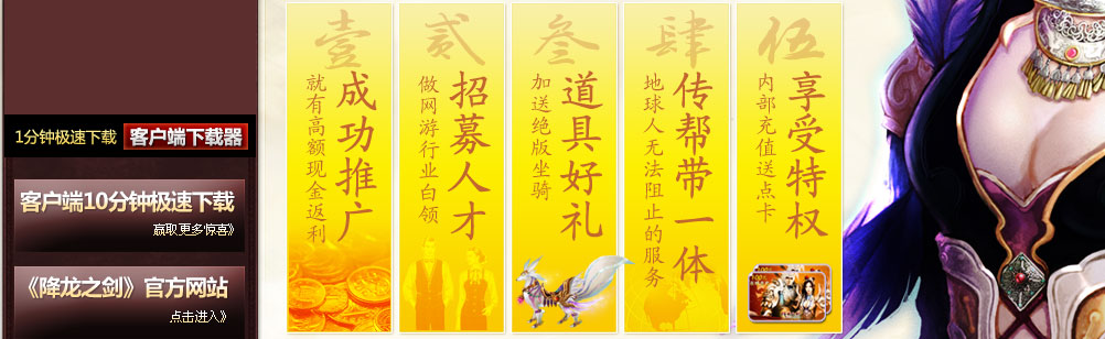 玩家通过分享推广、赚钱经验(如在论坛、百度贴吧等地发帖、在网吧等人流量大的地方张贴海报等推广方式),给予推广最给力的玩家青龙之影奖励。其他参与玩家还有机会获得精美周边奖励!