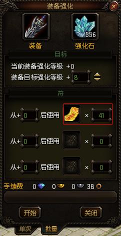3、在强化装备界面放入所要强化的物品,然后放入所对应的装备强化石,点击强化即可(可单次强化,也可选择批量强化)。如图所示: