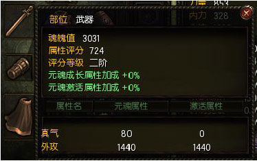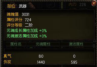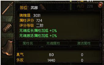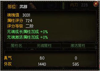 对应元魂的部位,如上图武器元魂,必须在装备对应武器才能激活元魂部位的属性,也就是说元魂增加的外功值,只有在装备外功武器时才能被激活。