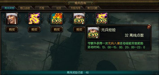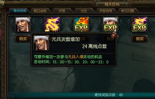 3、通过离线奖励点数,可以额外购买元兵入侵活动的双倍经验。只要有足够的点数并且在限定时间内便可使得元兵入侵活动奖励加倍。