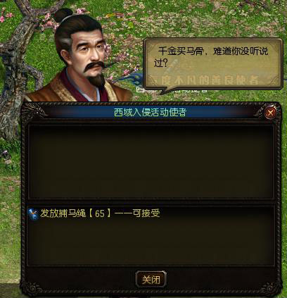 1、活动开始后,根据系统的喊话提示,去相应阵营的边境,找西域入侵活动使者领取抓马道具——捕马绳。要达到60级才能接受任务。