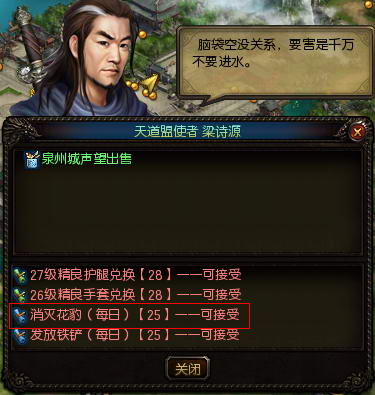 大侠们在泉州城可以找到天道盟使者 梁诗源。如下图: