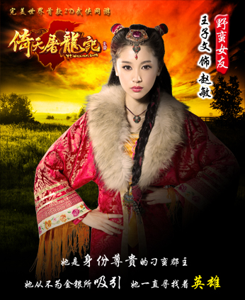 赵敏,金庸小说《倚天屠龙记》的女主角,为金庸笔下最聪明、最受读者喜爱的人物之一。汝阳王之女,手下皆为武林中最顶尖的高手,曾经对六大派下毒手。她灿若玫瑰、风情万种、机灵剔透、足智多谋、精明能干、直率豪爽,具有雄才大略,曾期许自己能创一番大事业。她敢爱敢恨、追求爱情勇往直前,并不像传统汉族女子的忸怩作态。在《男人帮》中饰演潇潇的王子文,此次,在《倚天屠龙记》,饰演赵敏这一角色。潇潇和赵敏一样,都是为了爱不顾一切的两位痴情少女,而王子文将二者诠释得可谓是惟妙惟肖。