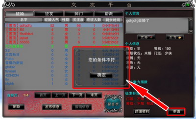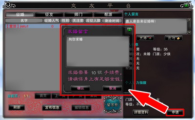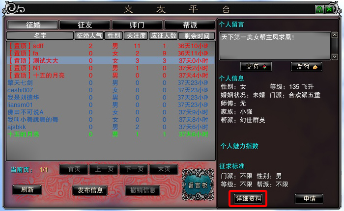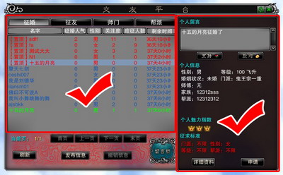 想通过《诛仙》交友平台,在众多发布信息的玩家中寻找伙伴,寻觅真爱?只要你登录交友平台,选中你想要查看其详细信息的玩家后,在交友平台界面的右侧上方就会显示此玩家的角色信息:个人留言、人气指数、征求标准、个人资料等。