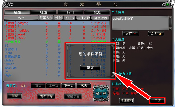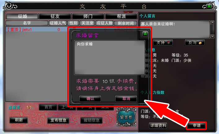 如果你想对发布信息的帅哥或美女求婚,只要点击右下角的“申请”按钮,填写上你的留言即可!