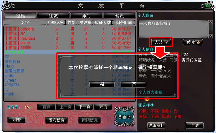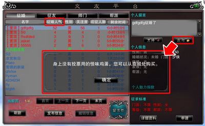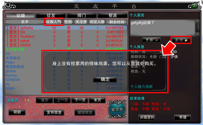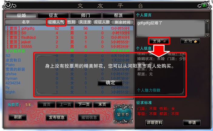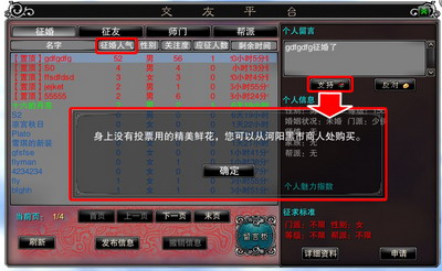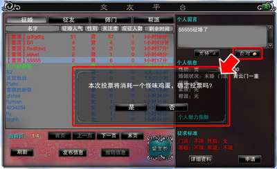 你也可以为对方发布的信息进行投票,投支持票可提高对方1点人气(需要使用精美鲜花)、而投反对票则可降低对方1点人气(需要使用怪味鸡蛋)。