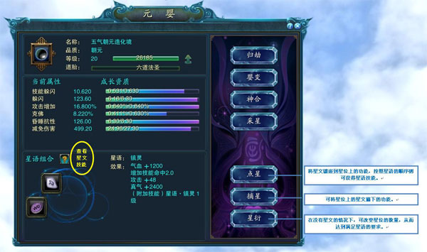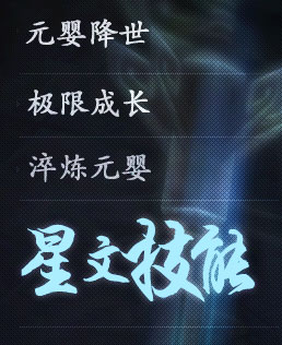 10级元婴将自动激活星文组合功能。使用不同星文镶嵌在元婴的星位中,将生成星语技能。星语技能所需的星文必须要和星位吻合,比如:2个星文的星语技能,需要2个星位的元婴,才能令技能发挥作用。如图,