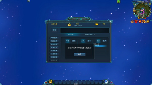 1、天帝可以需要帮助的时候发出亲卫传送功能,将亲卫传送至自己的身边(可跨线传送),且不消耗国力值