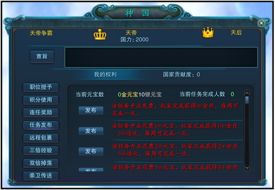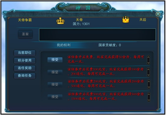 天帝可在神国界面发布神国任务,每次任务发布需间隔7天,根据难易程度由易到难共四种任务,根据神国任务的难易程度,发布任务时天帝需要消耗的元宝数量也不同。