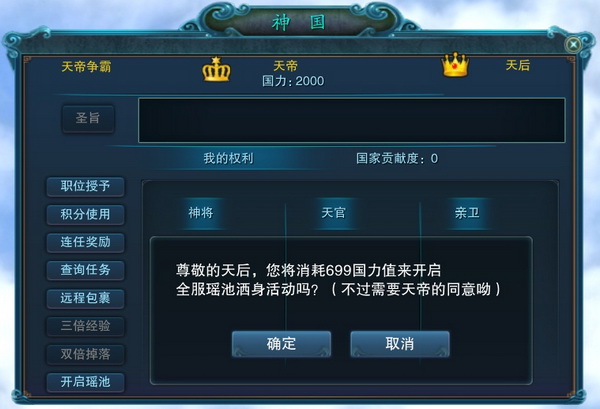 第二种:天后每天可消耗699国力值开放一次瑶池活动。(每周六:20:00—21:00此期间除外)