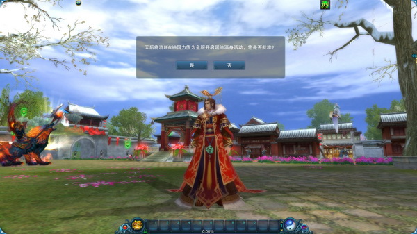 天后开启瑶池活动时需消耗699国力值,但开启瑶池前需经天帝同意后方可开启。天后成功开启瑶池活动后,系统会发布广播告知各位玩家,同时角色会弹出瑶池活动开启的系统提示。