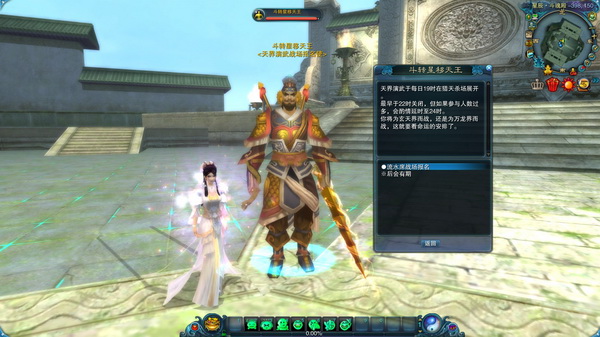1、玩家与NPC斗转星移天王【-398,150】对话即可进行报名。如果战场为开启状态,则进入正常报名流程;如果未开启,则提示玩家此时战场未开启。