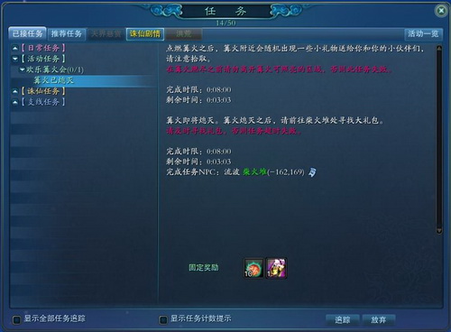 "欢乐篝火会"任务限时8分钟,需在篝火熄灭之后(篝火燃烧4分30秒),任务时间结束之前找柴火堆完成任务。开启篝火任务的玩家在任务未结束这段时间内不能离开篝火附近范围,否则任务失败。