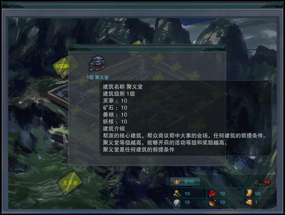 | 聚义堂 | 帮派的核心建筑,帮众商议帮中大事的会场,任何建筑的前提条件。 聚义堂等级越高,能够开启的活动等级和奖励越高。 聚义堂是任何建筑的前提条件 |