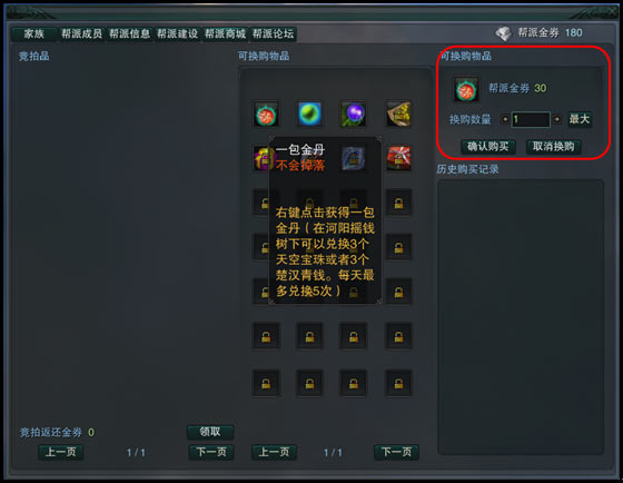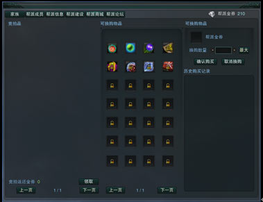 随着帮派基地建设等级的提高,帮派商城中开放的可换购物品也就越多,帮派成员享受的福利也就越多。帮派成员可使用帮派金劵换购帮派商城中的道具。