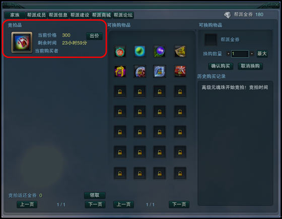 2、竞拍物品只能使用帮派金劵进行竞拍,竞拍每次加价不得低于1帮派金劵