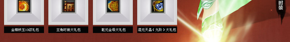 注:【金精铁玉10级礼包】、【主角时装大礼包】、【乾元金母大礼包】、【混元天晶(九阶)大礼包】内含“十铁碎片礼包”1个,打开可获得:被戾气笼罩的十级铁玉碎片1个。
