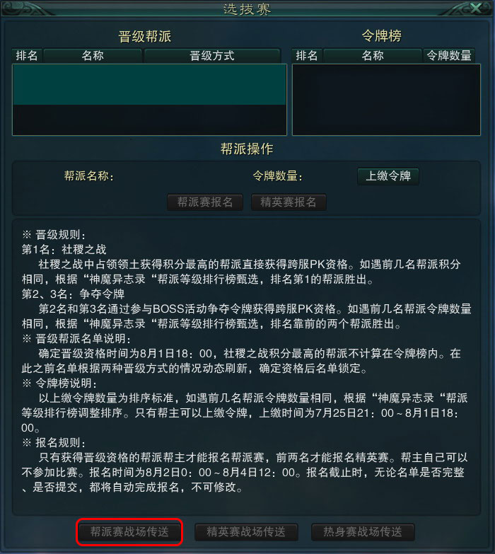 2、当天比赛的双方队员通过NPC 灵境天尊 兰将军(409,412)对话,选择“跨服PK争霸赛”打开选拔赛界面,点击下方的“帮派赛战场传送 ”从原服进入中央服务器的报名房间。
