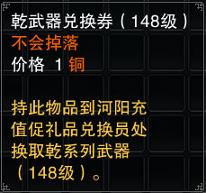 可在河阳充值奖品兑换员处,换取14种职业的148级乾武器之一。