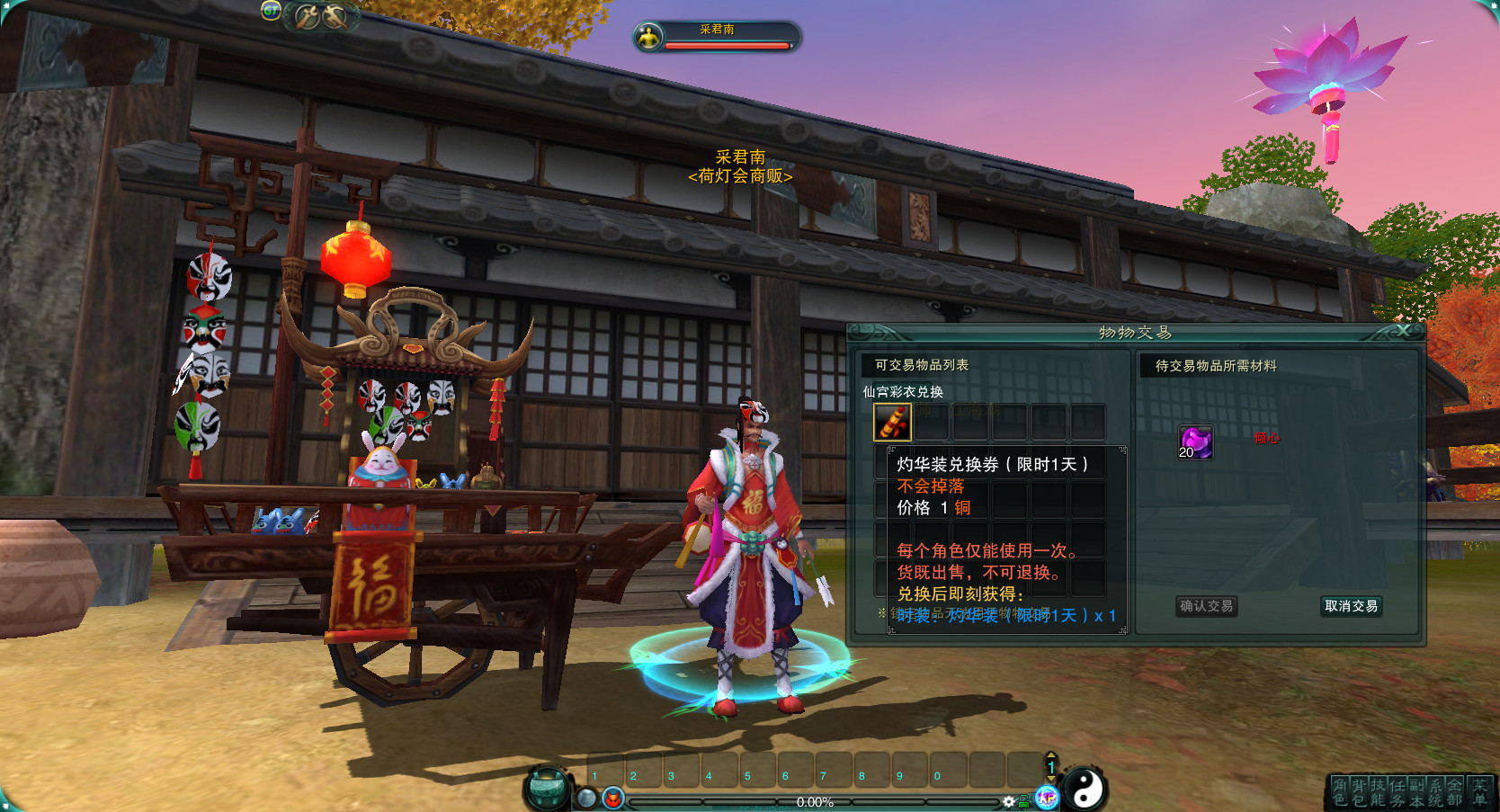 兑换时装:仙友可在流波商贩采君南处使用20个"倾心"兑换1张限时时装兑换券,获得兑换券后即刻触发兑换任务,系统将根据角色性别,自动发放对应角色性别的限时1天精美时装:灼华装1套。