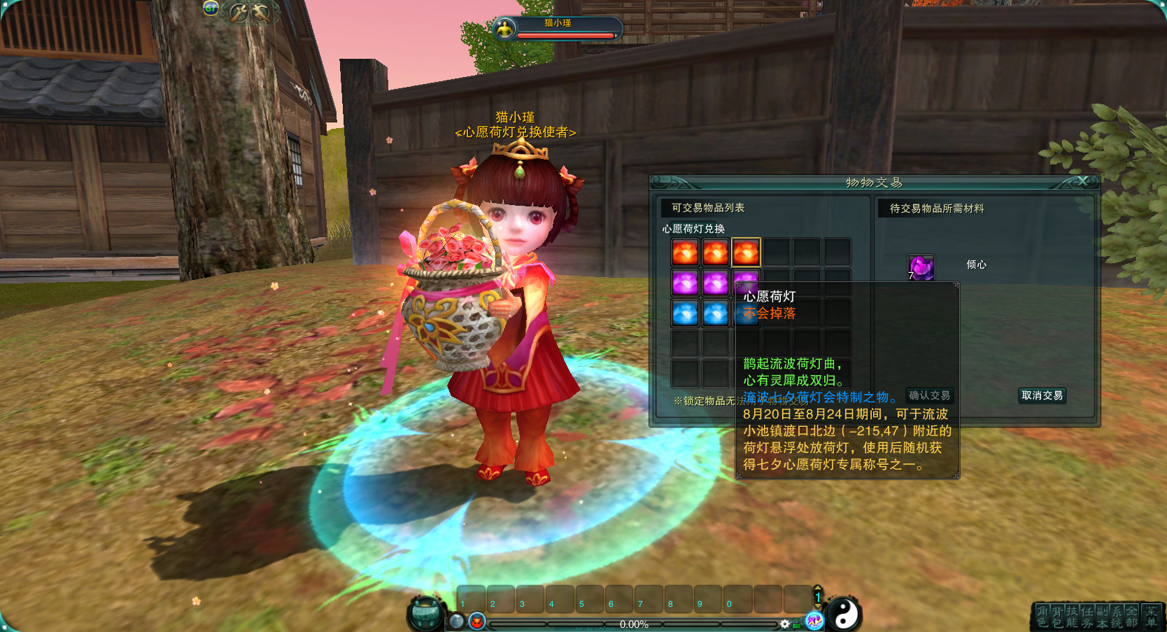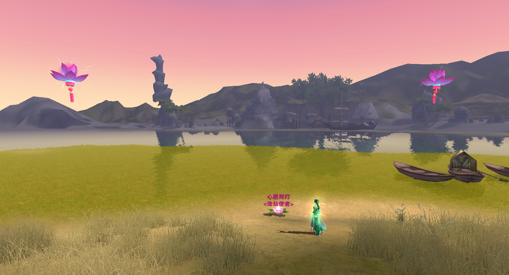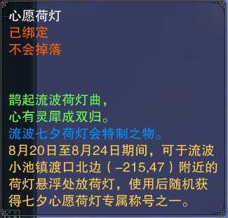 放飞荷灯:仙友可在8月20日20:00至8月24日期间,在流波小池镇渡口北边,悬挂着两盏荷灯处(-215,47)放荷灯。