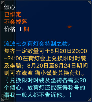 注:道具"倾心"可在8月20日开启的"七夕荷灯会"上兑换限时坐骑、时装,及放荷灯。