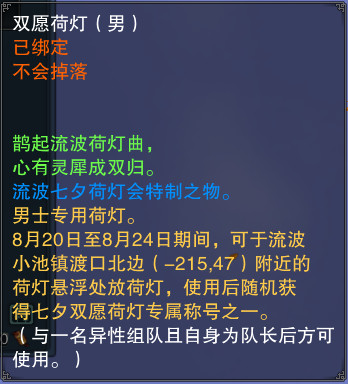持有双愿荷灯(男/女)的仙友,需与一名异性角色共同组队且自身为队长,需队长拥有对应角色性别的双愿荷灯(男/女),队长才可在小池镇渡口北边的悬挂着两盏荷灯处放荷灯,放后双人皆可将获得情缘值及特有尊号的奖励!