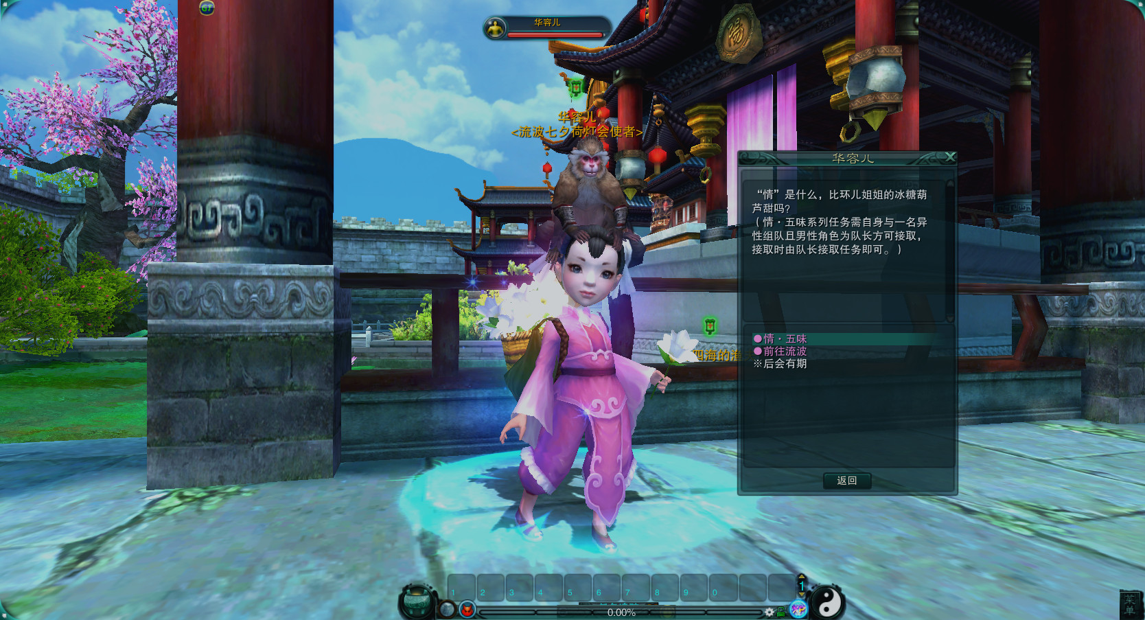活动期间仙友们上线后,可接到河阳 华容儿(405,453)发出的指引任务:情•五味-心有灵犀成双归。与华容儿对话完成指引任务,可了解到此活动需要自身与一名异性组队,且男性角色为队长,接任务时由队长接取即可。
