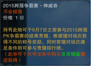 1、2015跨服争霸赛•神威券获得方式:在天帝宝库中购买道具"沧灵锦盒"赠送获得,道具"沧灵锦盒"限时销售,将于9月7日24点下架。