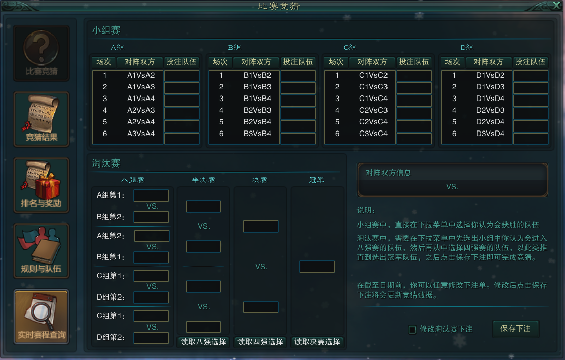 注:玩家根据比赛队伍竞猜,但最终的结果只根据对应的位置是否胜利来判断,也就是说,小组赛猜错了某场比赛的胜利队伍,那么有可能后面的淘汰赛比赛的队伍已经不是玩家所猜的队伍,但是在淘汰赛的时候猜对了胜利的队伍对应的位置编号,那么我们也判定此场比赛猜对。