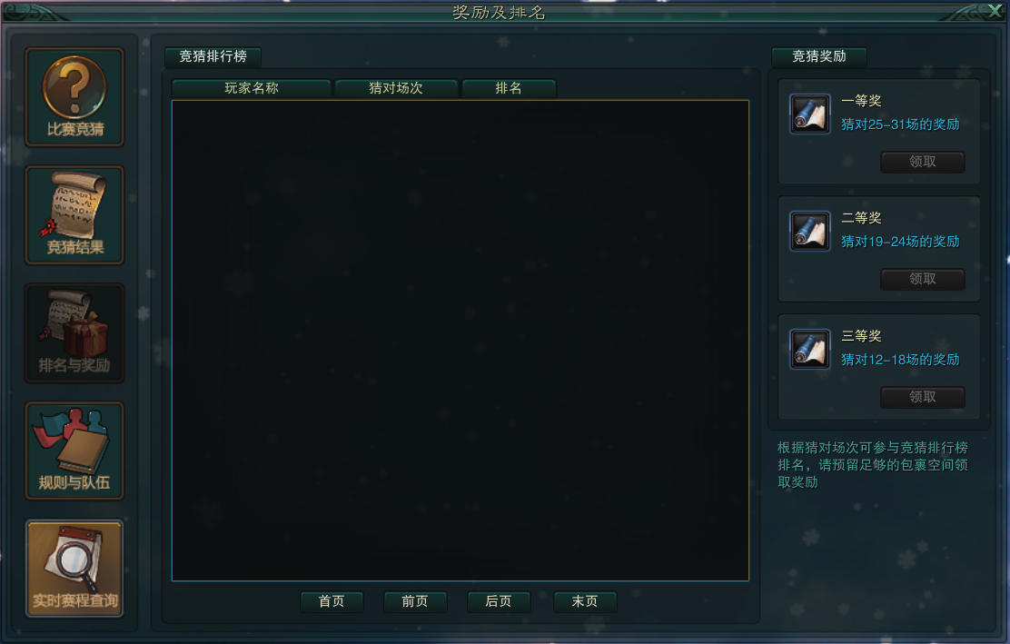 使用"2015跨服争霸赛•神威券"参与竞猜的玩家可以参与竞猜排行,按照场次从高到低进入排行榜。排名奖励:13级金精铁玉*1(绑定)