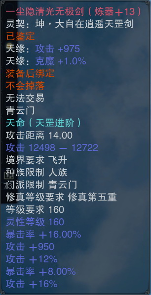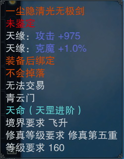 注:天命装备的武器有职业区别,初始会显示出装备部位、等级类别、职业种族要求以及天缘属性,不可交易。