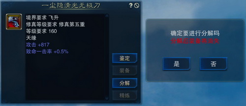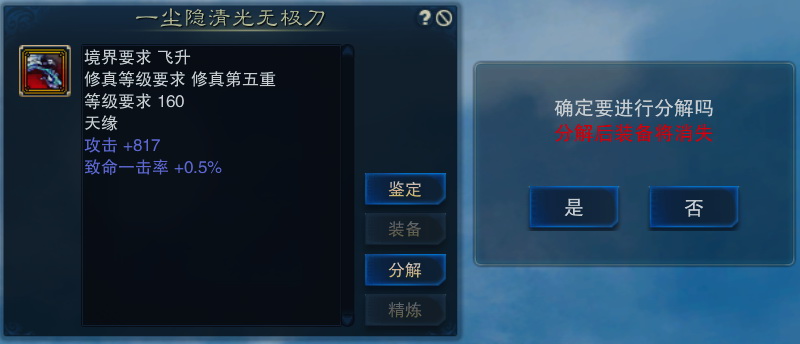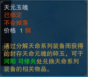 无论天命装备是否经过鉴定,玩家随时都可以对其进行分解操作。右键点击天命装备即可弹出天命装备界面,点击界面中的"分解"按钮即可操作分解。装备分解后将获得道具"天元玉魄",道具"云天玉魄"可在河阳 司修共处NPC处兑换天命装备相关物品的服务。