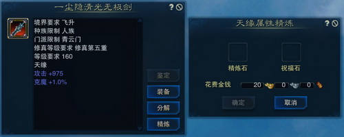 2)天缘属性精炼成功则增加一个精炼等级,精炼失败则减少一个炼器等级(与现有装备炼器相同),但天缘属性的精炼失败,不会导致天命装备消失。