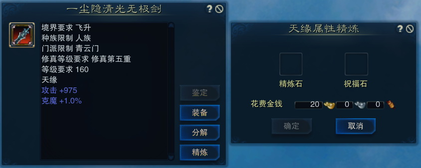 玩家需使用精炼石"墨魂琅华"及消耗20金币,才可以对天命装备的天缘属性进行精炼,精炼有失败的概率。祝福石"瑞气符"不是精炼天缘属性的必备道具,是额外提高精炼成功几率的道具。