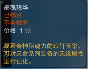 ②天命装备在副本中被玩家拾取获得后,初始形态是一个"坯子"的形式。玩家所能看到的只有天命装备的可装备部位、等级类别、基本操作要求和天缘属性,没有职业及性别等要求,不可交易。
