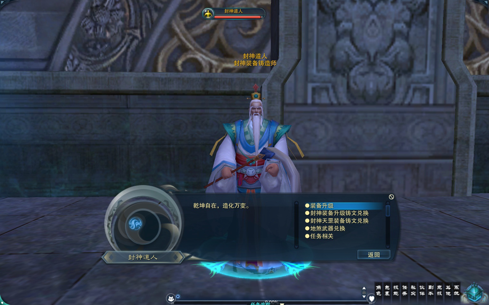 仙友可以在混沌(-320,-321)处NPC封神道人,选择【装备升级】进行天命装备的升级操作。天命装备的升级模式是:万象→太极→无极。
