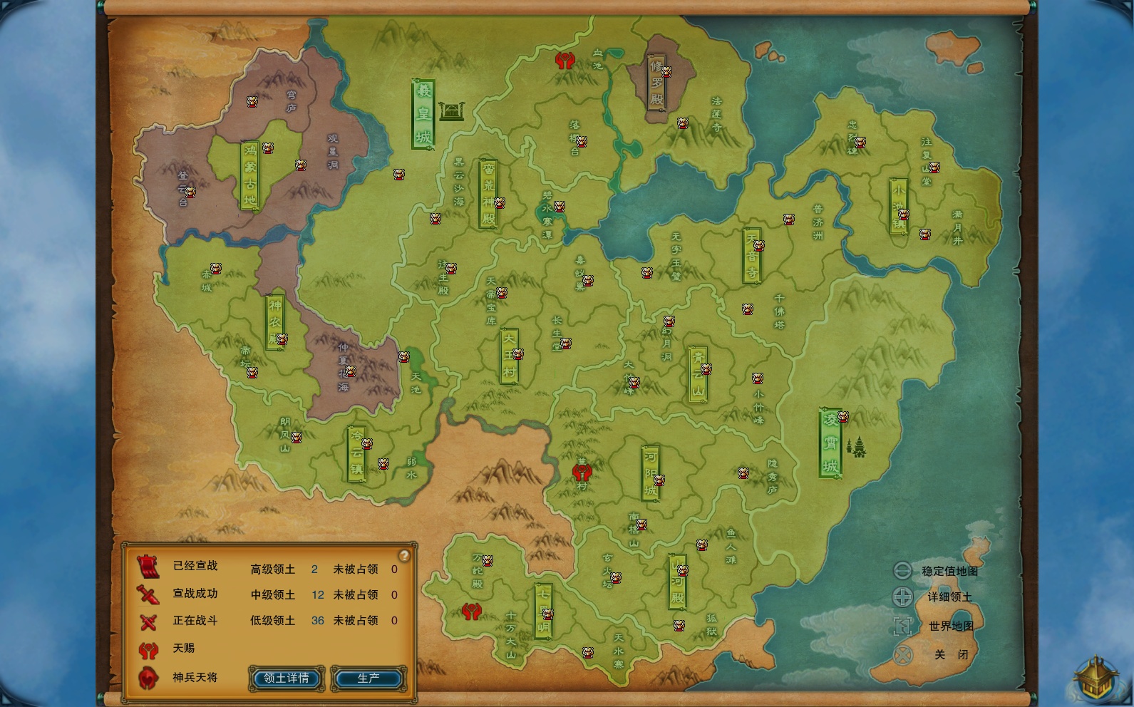 每周帮派可以向自己看中的领土下战书,如果某块领土无人占据,则需要你去"开荒",清除该块领土上的妖魔。