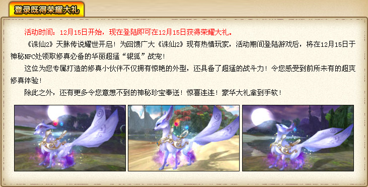 12月15日雪落河阳,冰封碧瑶降临诛仙,带来了荣耀大礼,同时也将其分身——战宠“银狐”带到您身边!