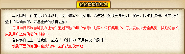 所有60级以上的玩家,进入游戏后找到“推广管理员-吴碧海”(河阳城坐标186,175;神域坐标265,-449)获取自己的推广ID。新玩家在创建新角色时填写由老玩家提供的推广ID,即可获得“金漆锦盒”。