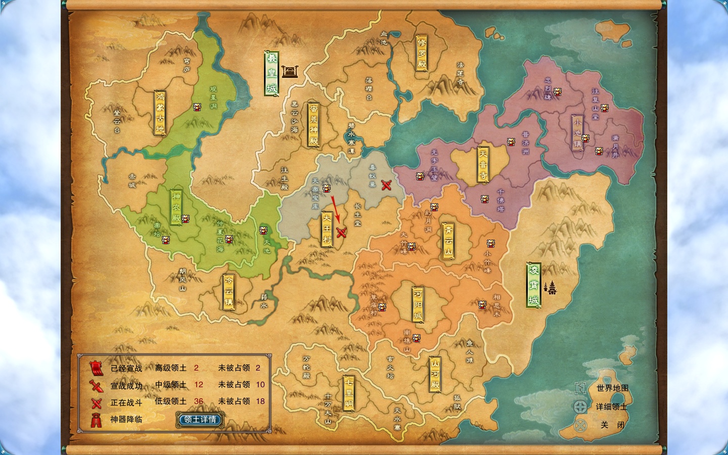 每周帮派可以向自己看中的领土下战书,如果某块领土无人占据,则需要你去“开荒”,清除该块领土上的妖魔。