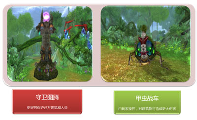 策略:在战场中会有迷踪林 使者为攻守双方提供物资援助。在这里可以建造守卫图腾和甲虫战车。【能量结晶】分布在攻守双方的阵营后方,大可安心采集。有效的安排【能量结晶】采集,第一时间利用甲虫战车推进到对方本阵前,是整场战斗胜负关键。