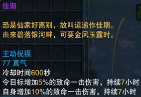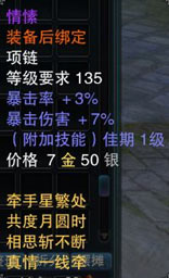 【情愫】——饰品项链,可以交易物品。装备后会获得不凡的属性加成,还配备独有的祝福技能“佳期”,使用后可提升角色的致命伤害,持续长达7小时。