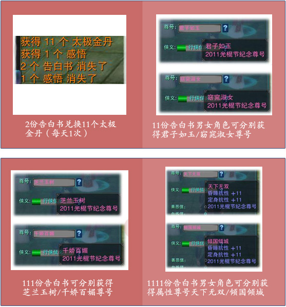 在光棍节系列活动中,能够获得节日专属道具【告白书】,通过收集可以兑换经验和节日个性尊号!