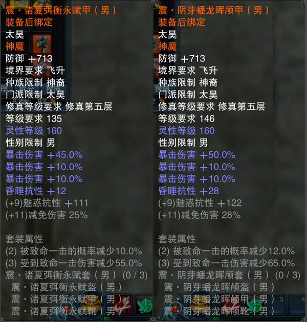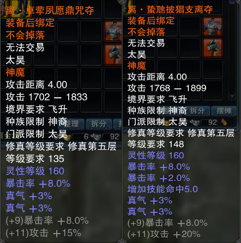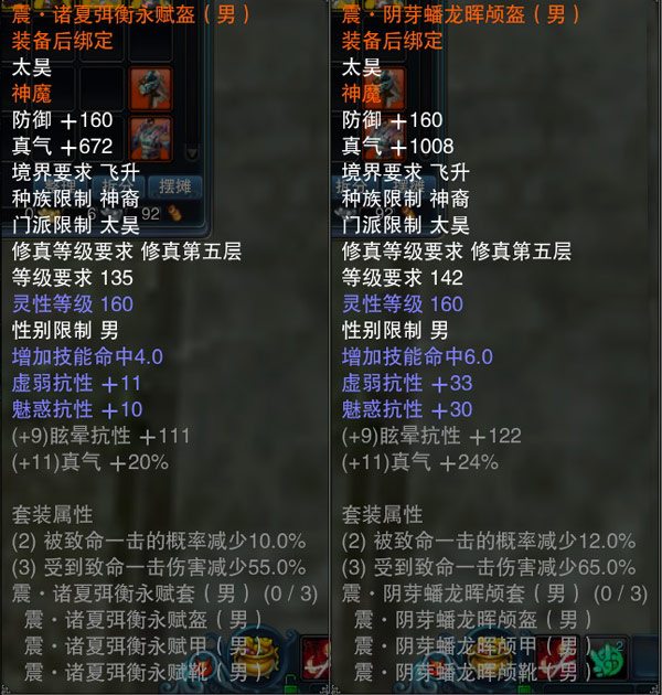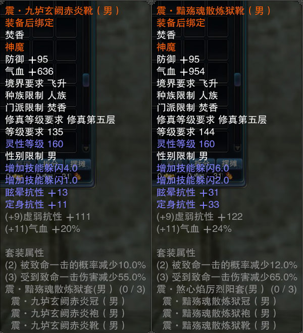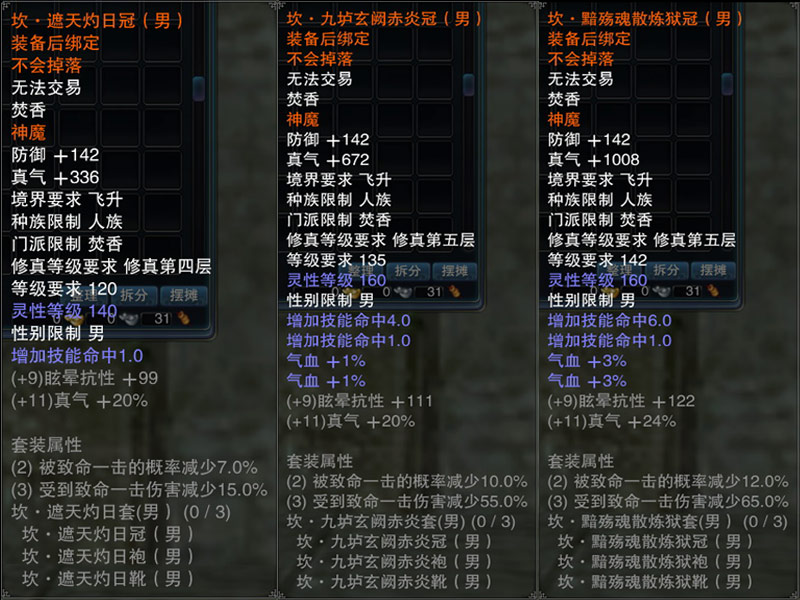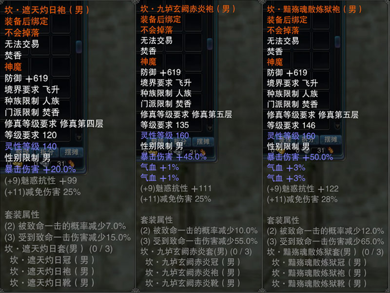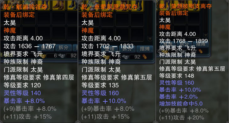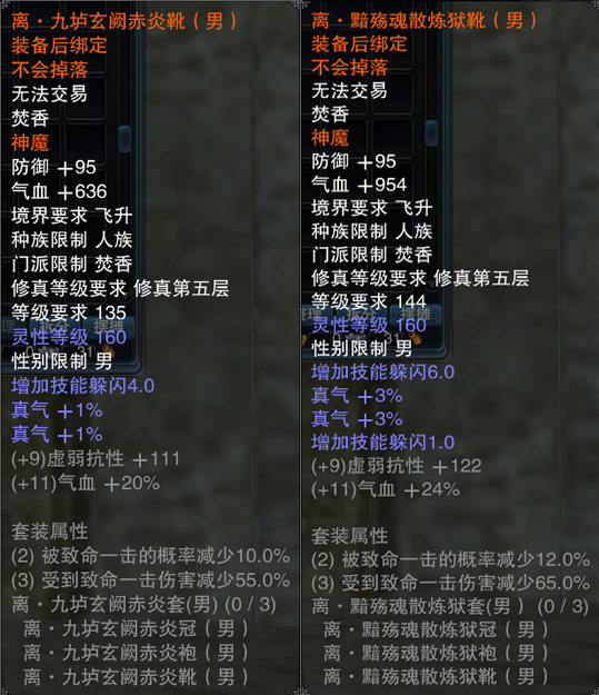 神魔装是专门为飞升角色打造的高级属性套装,共有乾、坤、坎、离、震五种套装,分别针对不同要求进行属性侧重。